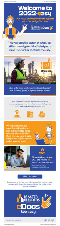 Master Builders WA launched a campaign in 2022 about their new eDocs system we created a variety of marketing assets for social media ads, organic posts, animated videos, EDMs, website landing page, banners and more.