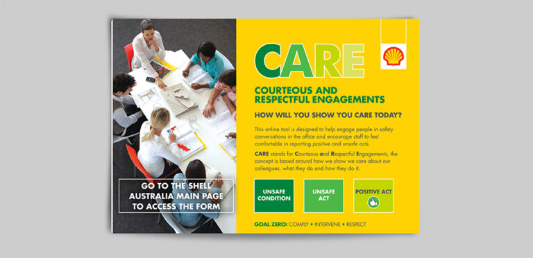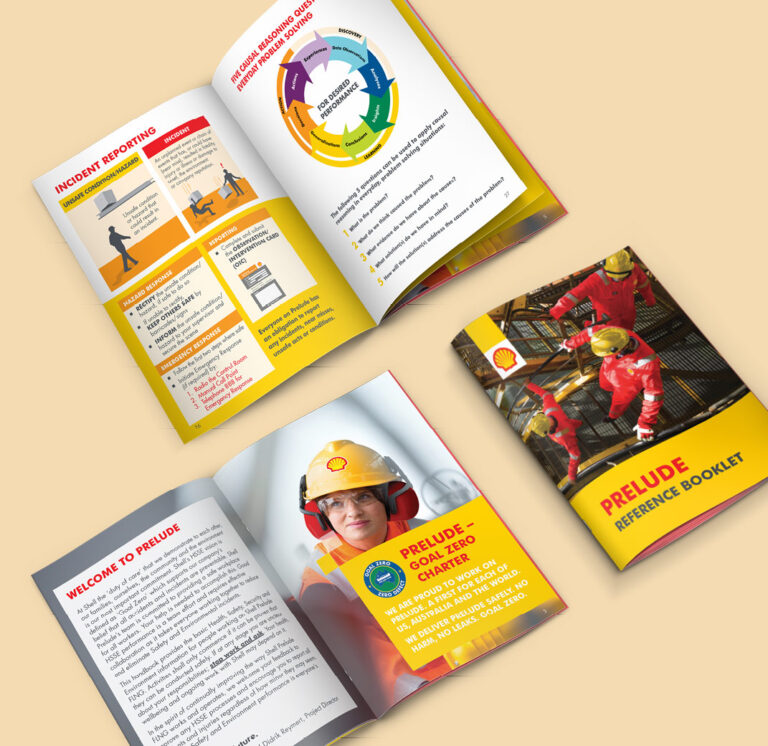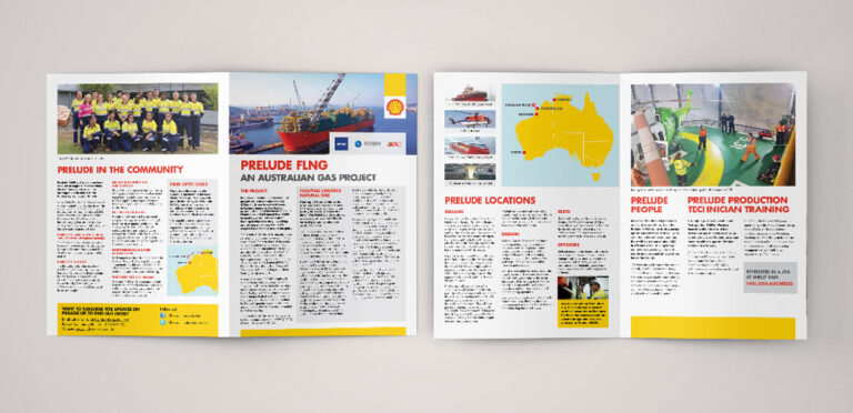 As a Preferred Supplier to Shell Australia, we work regularly with many members of Shell staff throughout different divisions. This involves both print and digital in a wide range of media including flyers, brochures, safety guides, posters, large format signage, press ads, in-office screen displays, digital interactive PDFs, e-newsletters and web banners. An example of one particular range is for Shell’s Prelude FLNG project that has included all of the previously detailed material.